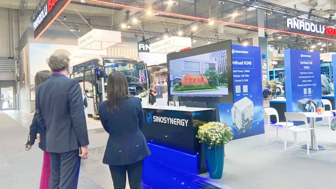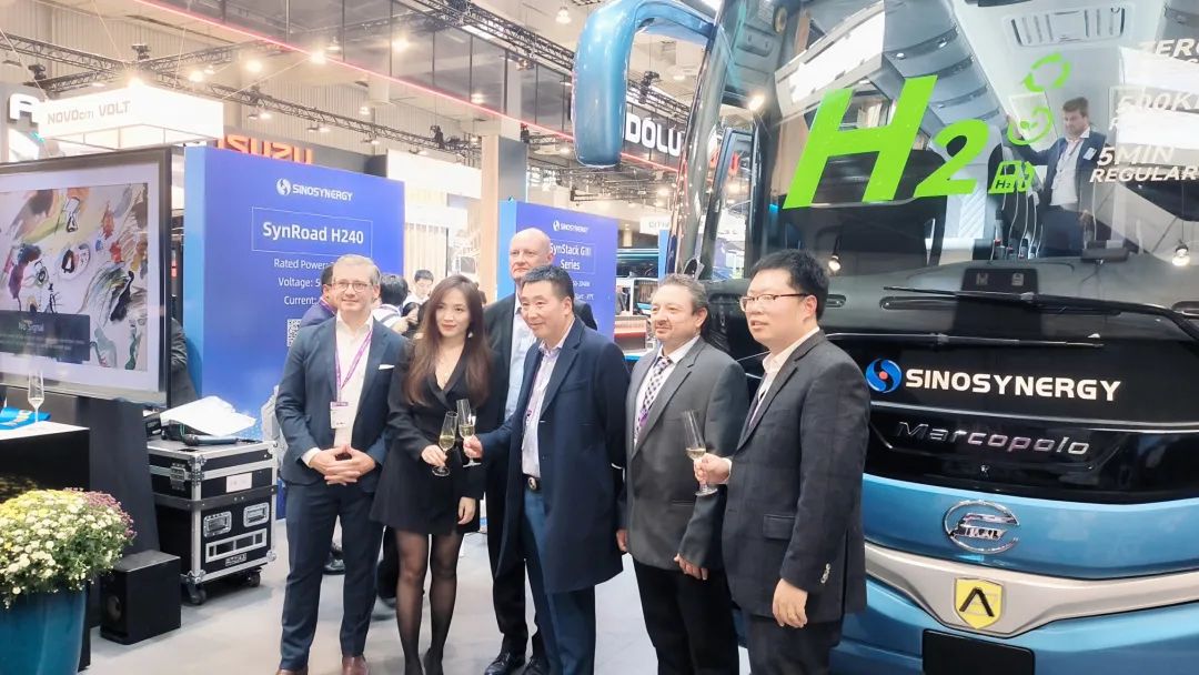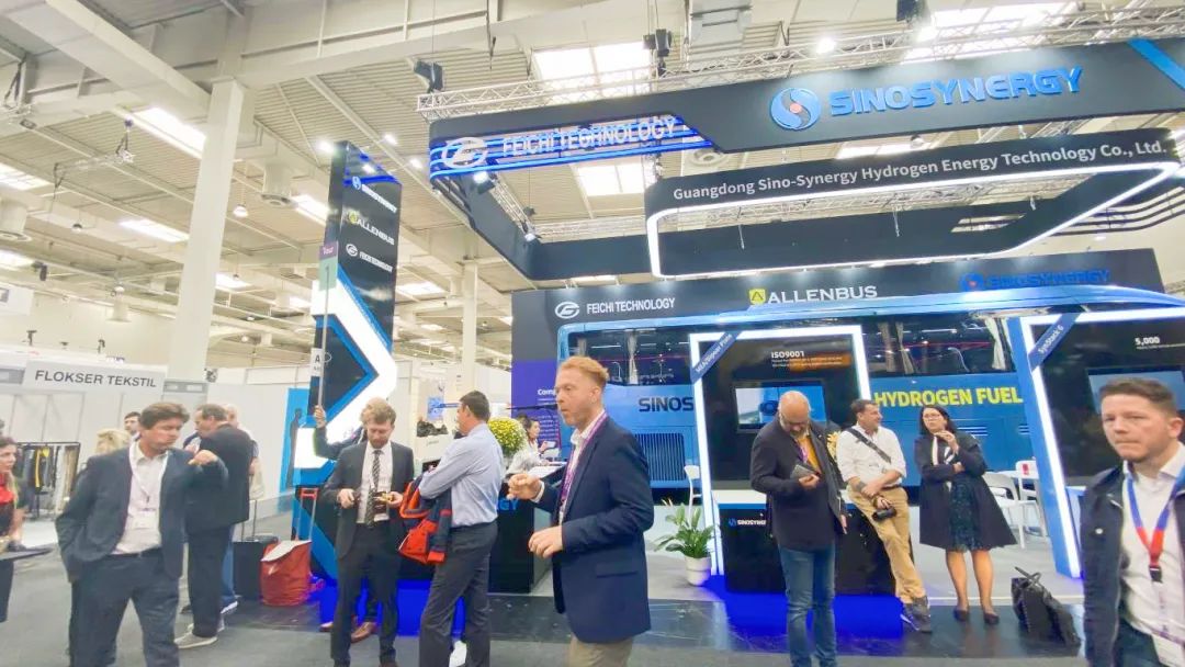 Sinosynergy also brought to the fair hydrogen-powered long-haul tour bus equipped with its proprietary high-power hydrogen fuel cell system, the first appearance of the vehicle on the European continent. The brand-new hydrogen-powered long-haul tour bus is jointly developed by Sinosynergy and its partners. From material optimization, product design, production and after service, multi-dimensional and multi-level assurance of passenger safety is provided to ensure comfortable, safe and clean travel experience. Hydrogen fuel cell buses are durable, comfortable, safe and free of carbon emission, and assure for each passenger a fresh and pleasant means of transportation. Sinosynergy attracted on the very first day of the fair flocks of exhibitors and guests to its booth.