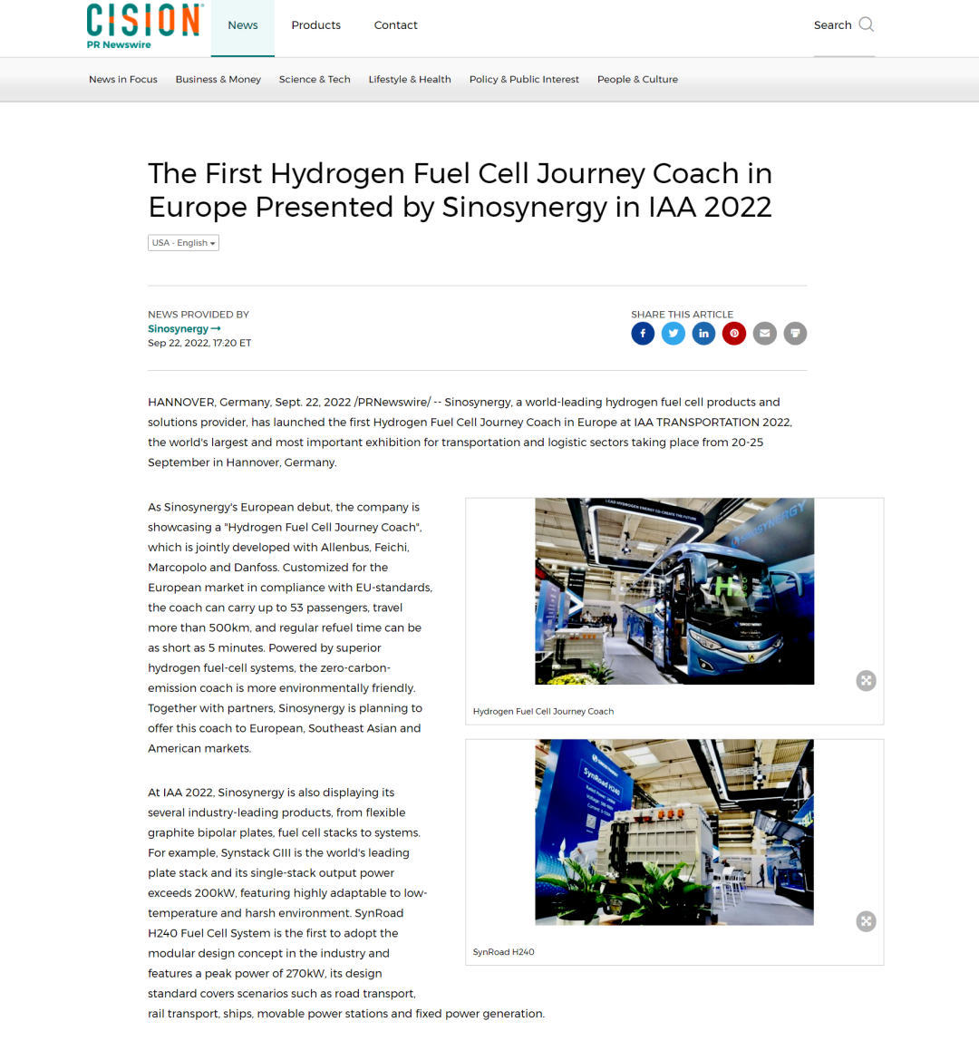 The wonderful appearance that Sinosynergy made in Germany had aroused the attention of more than 300 international media for coverage, and such famous media as PR, DPA, Adnkronos, Finanzennet, Yahoo, European Business (UK) and FOX (USA), in their report of "World Leading Hydrogen Fuel Cell Products and Solutions Provider Sinosynergy Launches on IAA Transportation 2022 Europe's First Hydrogen Fuel Cell Long-Haul Bus", stressed in particular on this historical event of the debut in Europe of the hydrogen-powered long-haul tour bus equipped with Sinosynergy system.